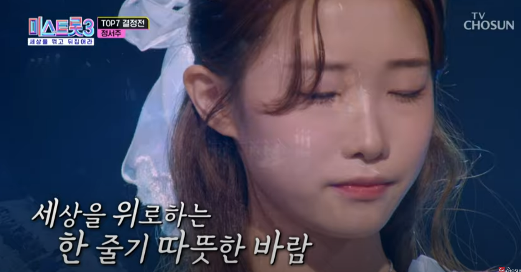 정서주는 '미미진진진'이라는 타이틀로 미스.미스터트롯 시리즈 동안 진선미를 내내 놓치지 않은 참가자로는 처음입니다. 정서주는 알고보니 혼수상태의 '바람 바람아'로 "상처받은 이 땅의 모든 이들 감싸고 싶다."라고 하며 정서주 특유의 맑은 목소리로 무대를 덮었습니다.