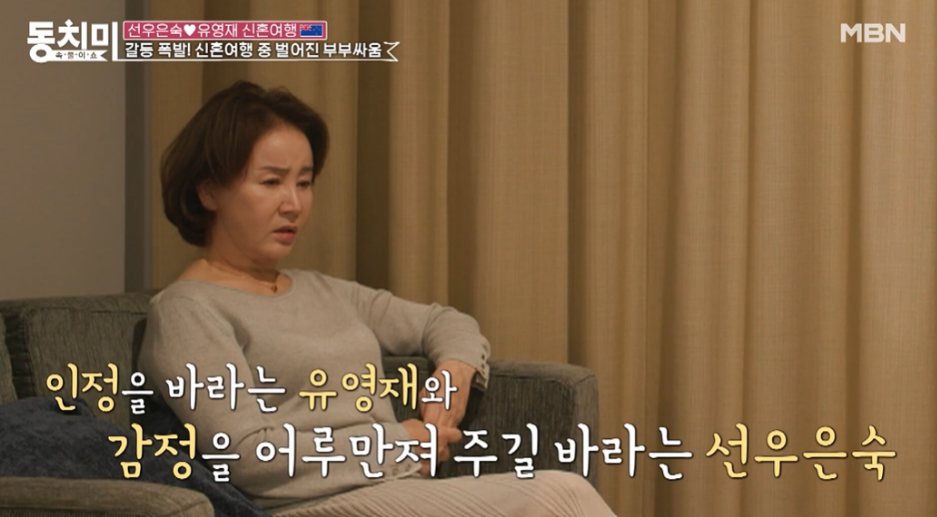 2023년 5월 20일 MBN '속풀이쇼 - 동치미'에서 뉴질랜드에서 두 사람의 신혼여행이 담겼고, 이날 선우은숙은 "결혼이 행복하지 않고 힘들다"며 "남편의 주장이 너무 강하고 배려심이 없다"라고 유영재를 나무랐습니다.