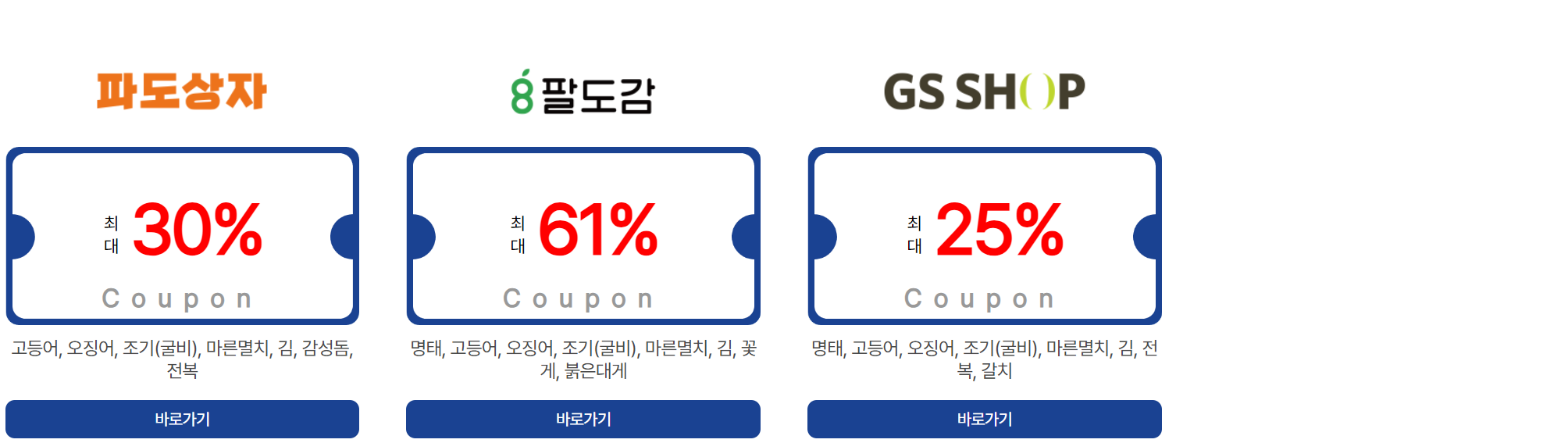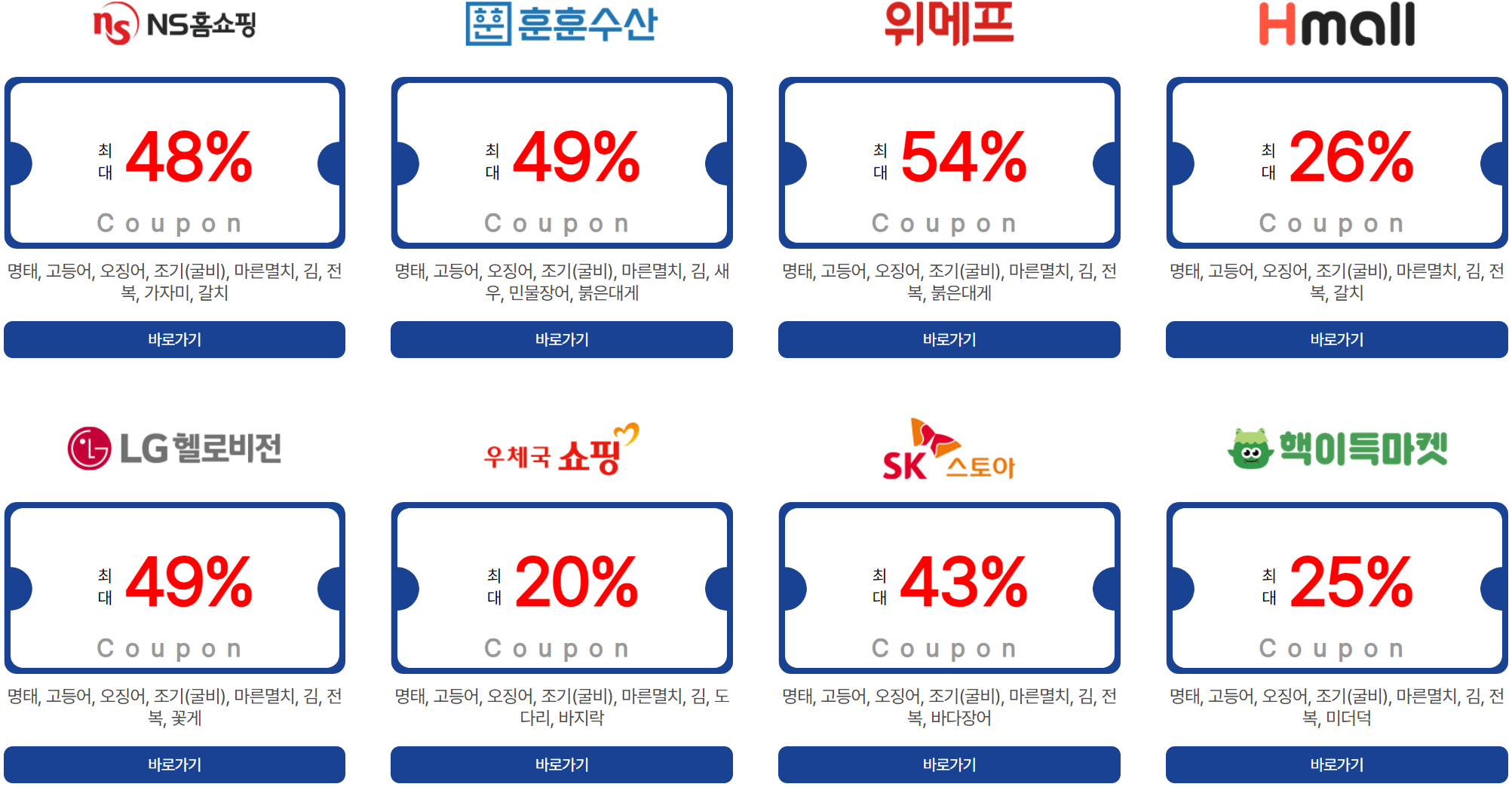 | 온라인 쇼핑몰 | SSG.COM, 공영홈쇼핑, 수협쇼핑, 토마토앱, 티몬, 11번가, 롯데백화점몰, 오아시스, 우아한형제들, 컬리, 카카오쇼핑, 농협몰, 쿠팡, AK몰, 비비수산, 캐시워크, 엔에스쇼핑, 훈훈수산, 위메프, 현대홈쇼핑, 제철장터, 우체국쇼핑, 에스케이몰, 내돈내산, 공유어장, 8도감, 지에스샵 |