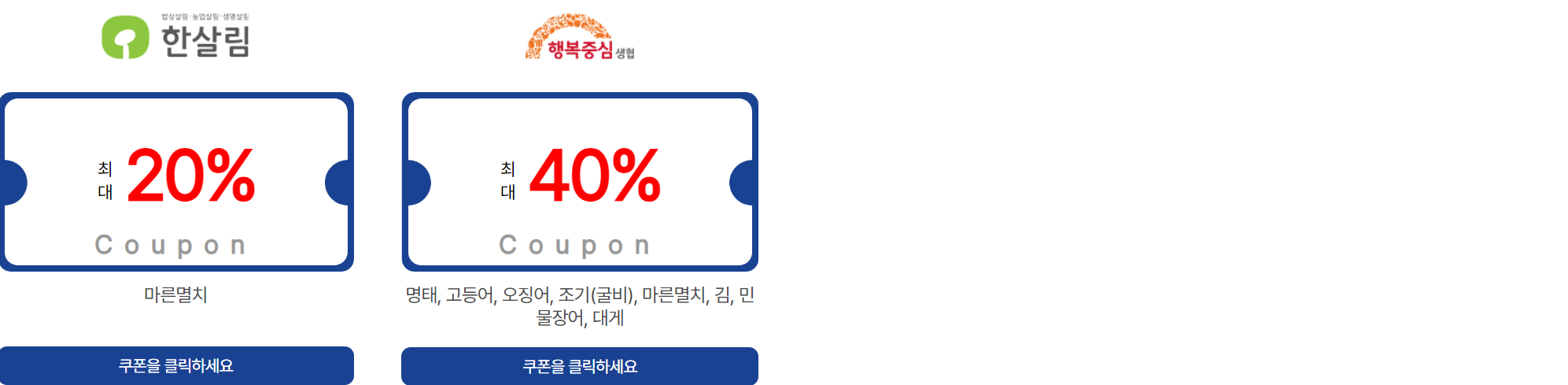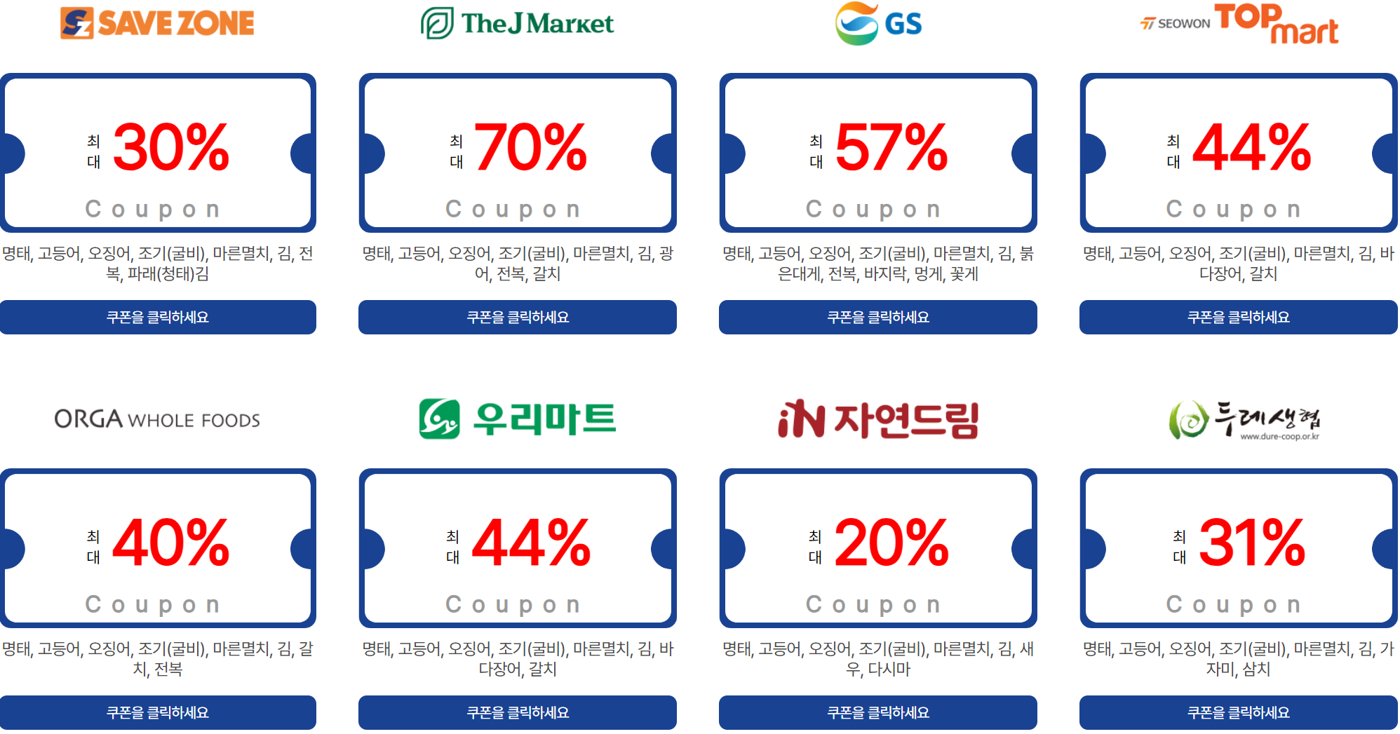 이마트, 홈플러스, 세이브존, 롯데마트, 한살림 등 총 18개 오프라인 매장에서 최대 50%까지 할인을 받을 수 있습니다.